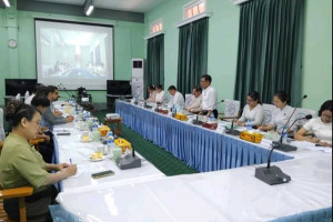 အစည်းအဝေးတွင် ဆောက်လုပ်ရေးလုပ်ငန်းများ ဆောင်ရွက်ပြီးစီးမှု အခြေအနေနှင့် ဘဏ္ဍာငွေသုံးစွဲ ပြီးစီးမှု အခြေအနေများကို ပုံနှိပ်ရေးနှင့်ထုတ်ဝေရေးဦးစီးဌာန ညွှန်ကြားရေးမှူချုပ်က Power Point Presentation ဖြင့် ရှင်းလင်းပြသခဲ့ပြီး