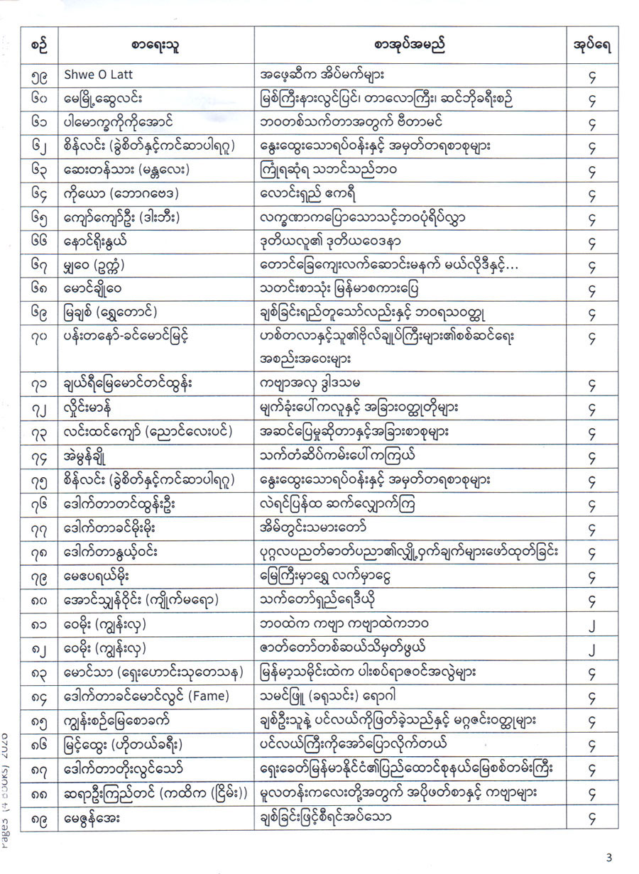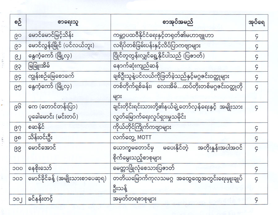 • ပြန်ကြားရေးဝန်ကြီးဌာန၊ ပြည်ထောင်စုဝန်ကြီး၏လမ်းညွှန်ချက်အရ ၂၀၁၅ ခုနှစ်အတွက် အမျိုးသားစာပေဆု ရွေးချယ်နိုင်ရေး ဖတ်ရှုစိစစ်ရမည့် စာအုပ်များ ထပ်မံ လက်ခံလျက်ရှိ